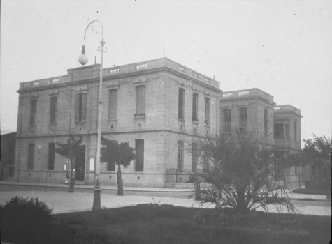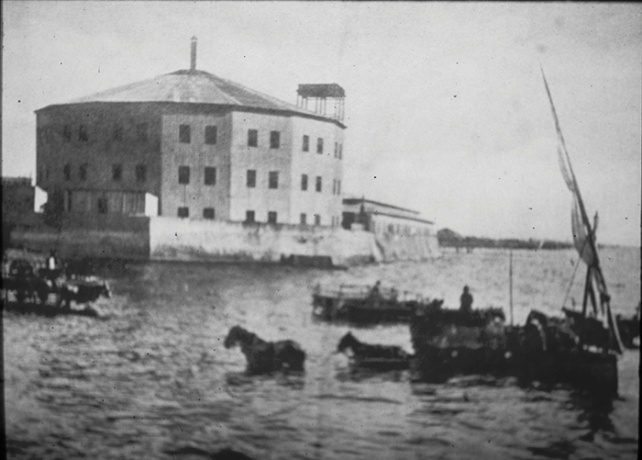 Fachada del Hotel de la Rotonda y zona de desembarco. Imagen del audiovisual. Original Archivo General de la Nación.