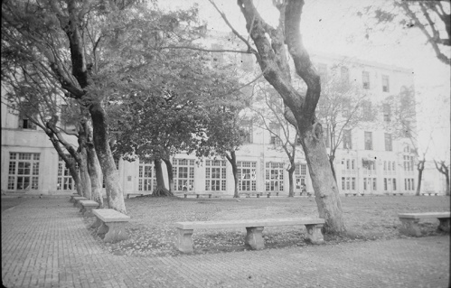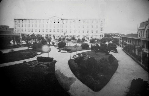 Imágenes de Los Antiguos Hoteles de Inmigrantes, referidas al antiguo parque del Predio de Migraciones en 1911 (fuente Museo de la Ciudad), e imagen obtenida en 1989 que muestra las grandes transformaciones del lugar, y el reemplazo de los jardines de flores por árboles.