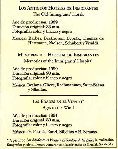 A partir de este período, y más precisamente del audiovisual Memorias del Hospital de Inmigrantes, las obras comienzan a desenvolverse en tres planos bien diferenciados: el documental, concerniente exclusivamente al contexto histórico – testimonial, el formal, que atañe al aspecto puramente estético, y un tercer sentido, hermanado en la médula del segundo y radiado hacia una expresión psicológica, que reemplaza a la meramente intelectual, de la que estableció sus lineamientos en los ensayos literarios citados y en otros que le seguirán.